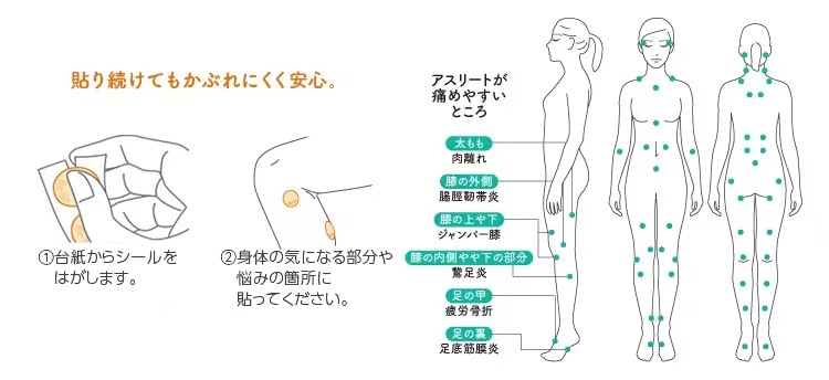 全身にお使い頂けます、肩、膝、腰などの気になる箇所、頭やお腹のお悩み箇所に貼ってください。